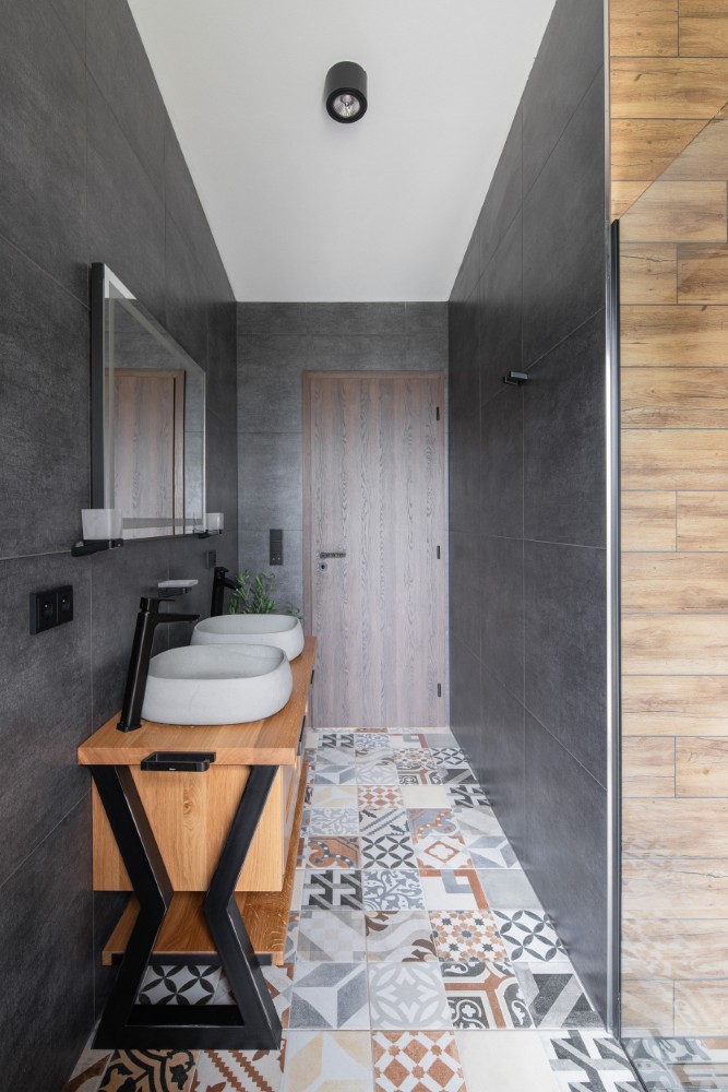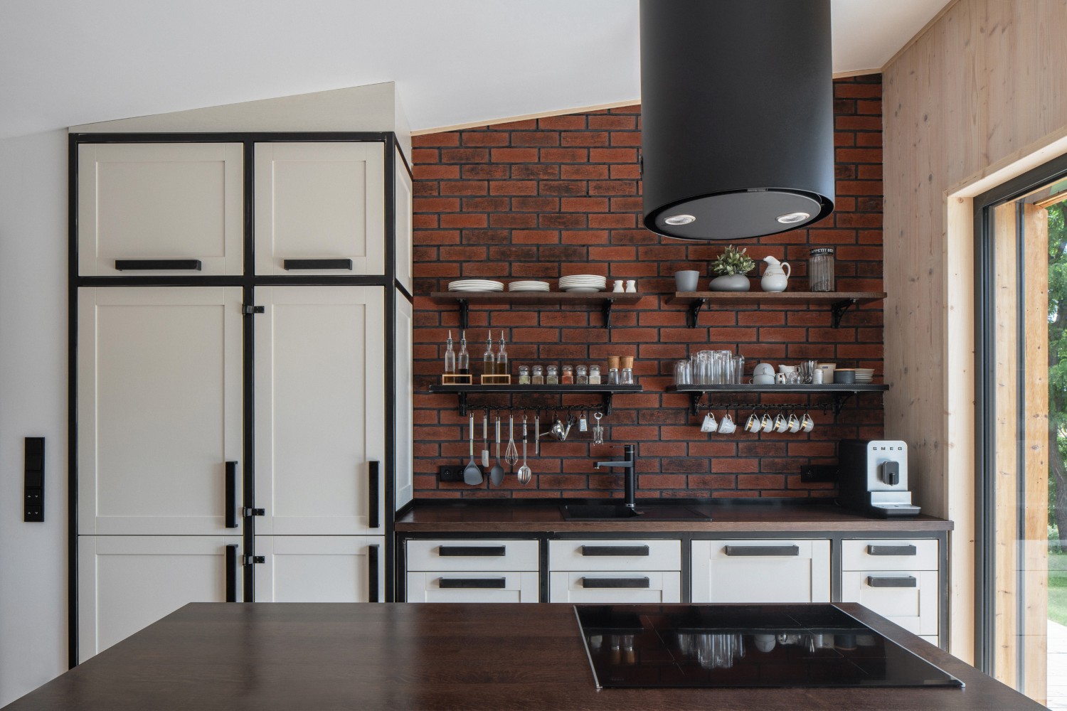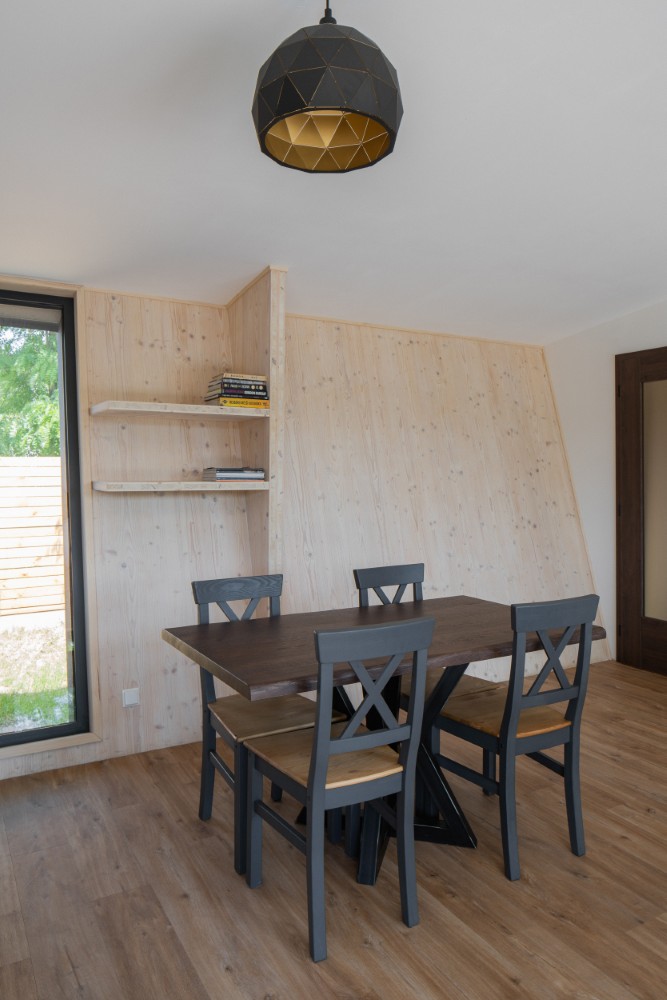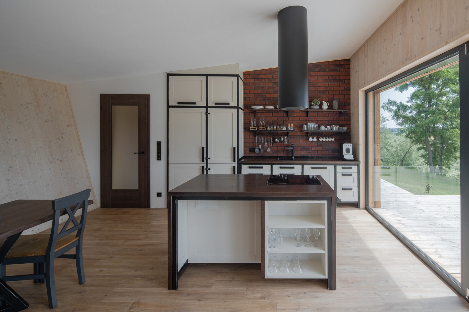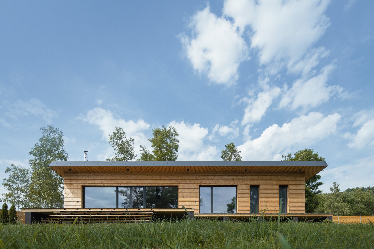 Dům stojí na mírném svahu a díky velkým proskleným plochám je neustále v kontaktu s okolní krajinou. V interiéru se uplatňuje kombinace dřeva a kovu, kterou doplňují ručně vyráběné kusy nábytku od místního truhláře. Vytápění zajišťuje elektrické podlahové topení ovladatelné na dálku, krb pak dotváří atmosféru. Stavba z CLT panelů se osvědčila i z hlediska tepelného komfortu – v zimě drží teplo, v létě chlad. Dům tak nabízí nejen technickou přesnost, ale i tichou pohodu víkendového útočiště.