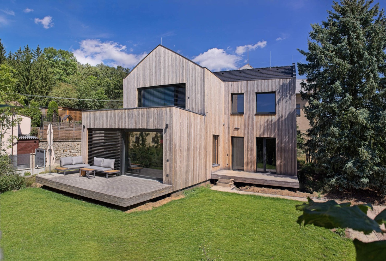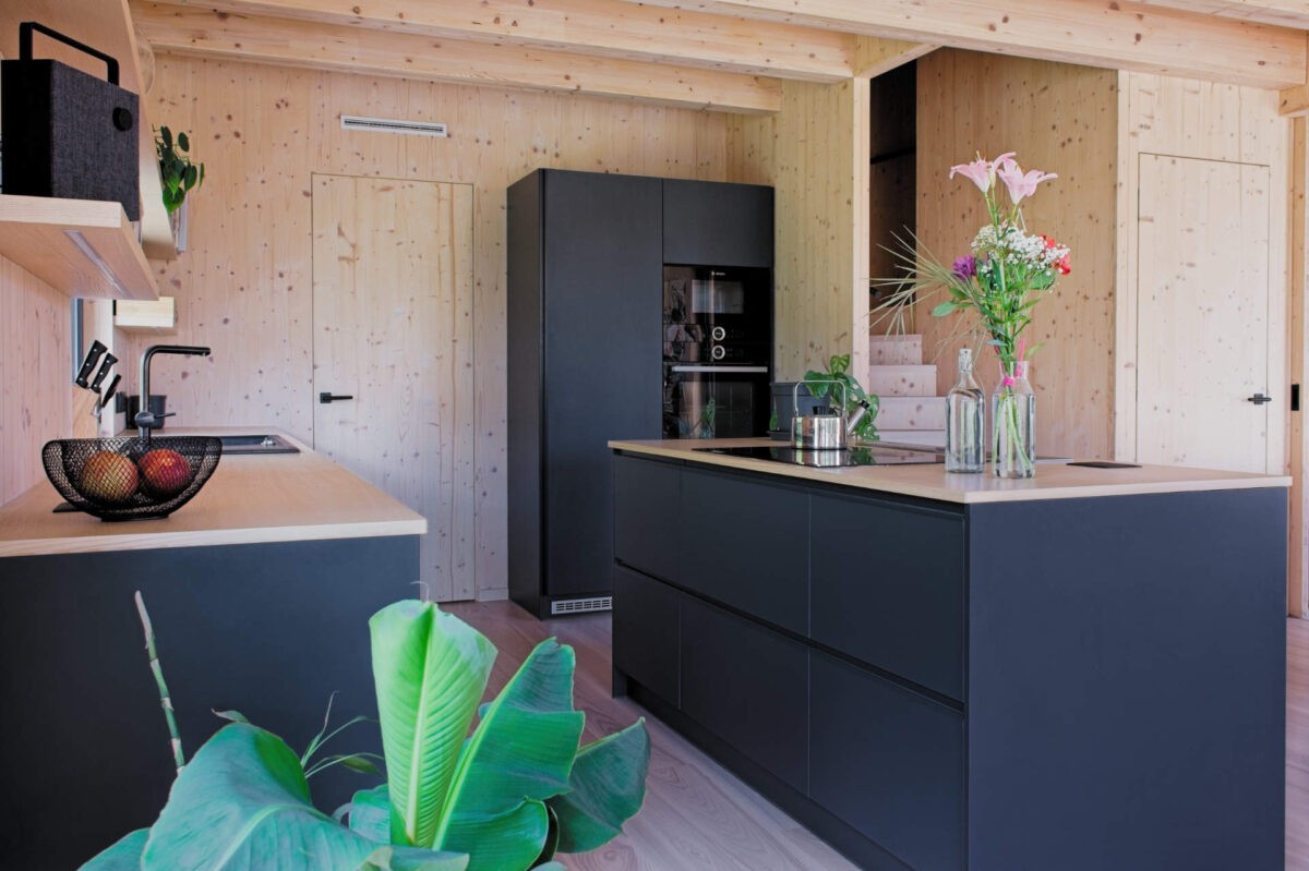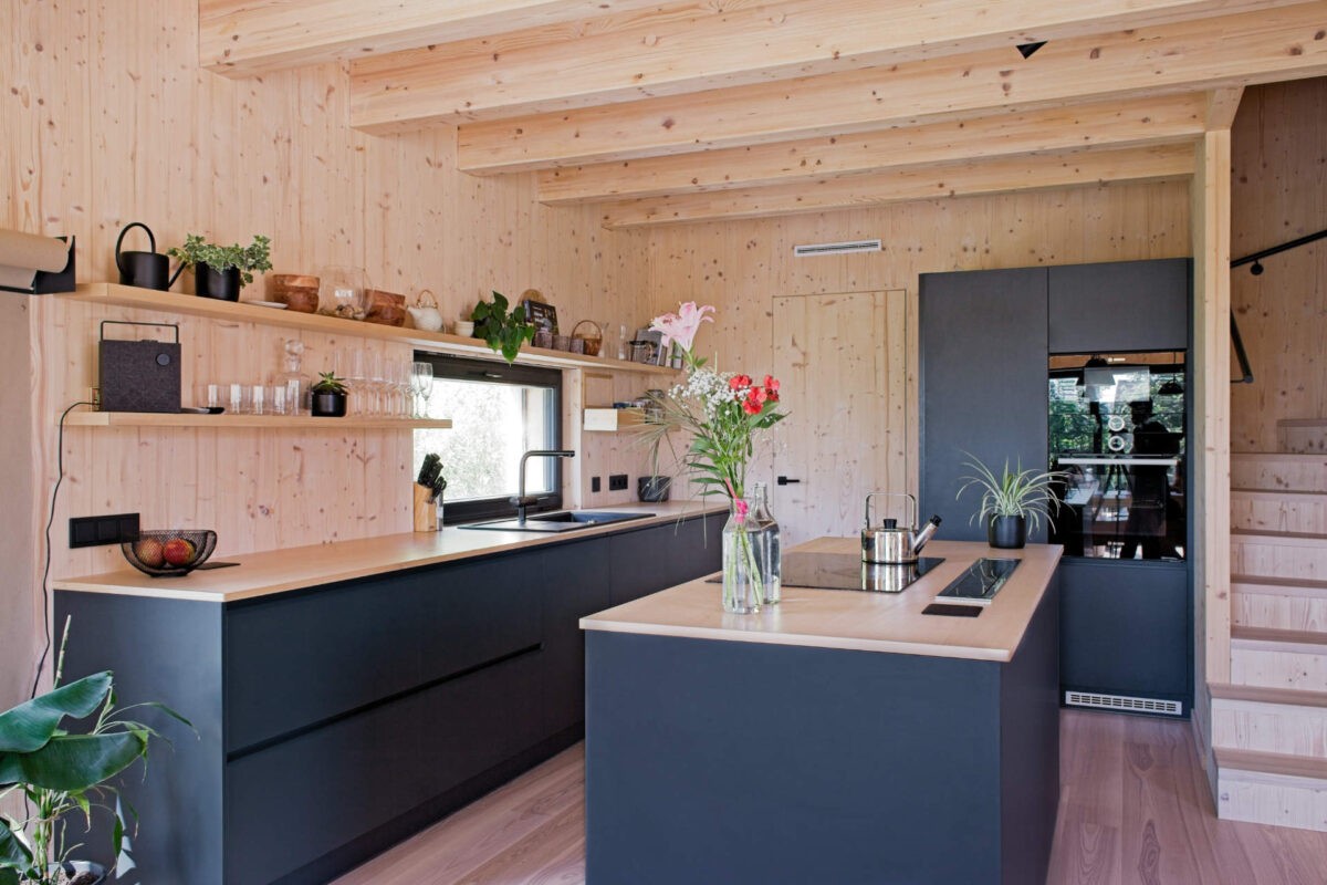 Uprostřed přírody stojí moderní dřevostavba, která spojuje současnou architekturu s přirozeným charakterem dřeva. Celodřevěná konstrukce vytváří příjemnou atmosféru s vůni přírodního materiálu. Tmavá fasáda kontrastuje se světlým interiérem, čímž vzniká jemná rovnováha mezi vnějším a vnitřním prostorem.
