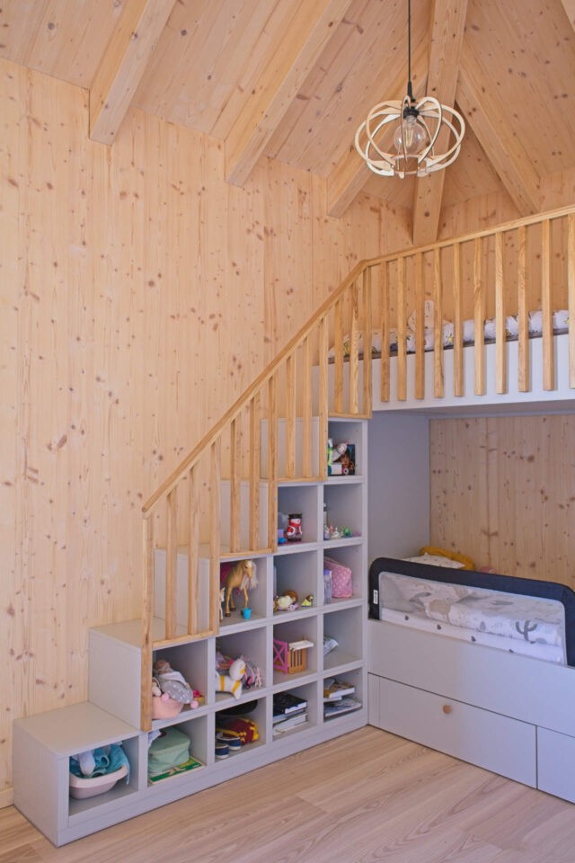 Velké prosklené plochy otevírají interiér do krajiny a umožňují výhled do rozlehlé zahrady obklopené smrky a keři. Obytný prostor je navržen tak, aby poskytoval světlo, klid a dostatek soukromí. Dispozice domu přirozeně rozděluje zóny – v přízemí se nachází obývací část s pracovnou a pokoji, horní patro je určeno dětem pro hraní i odpočinek.