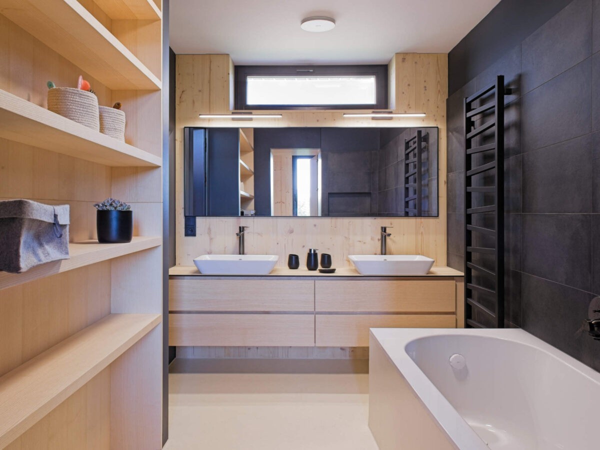 V interiéru převládají přírodní materiály a tlumené barvy. Kombinace šedých, krémových a dřevěných tónů působí harmonicky a podtrhuje klidný charakter prostoru. Kuchyně spojuje estetiku s funkčností, koupelna využívá čisté linie a přírodní struktury. Celek působí promyšleně, klidně a prakticky. Jako domov, který vznikl v respektu k okolnímu prostředí a každodenním potřebám rodiny.