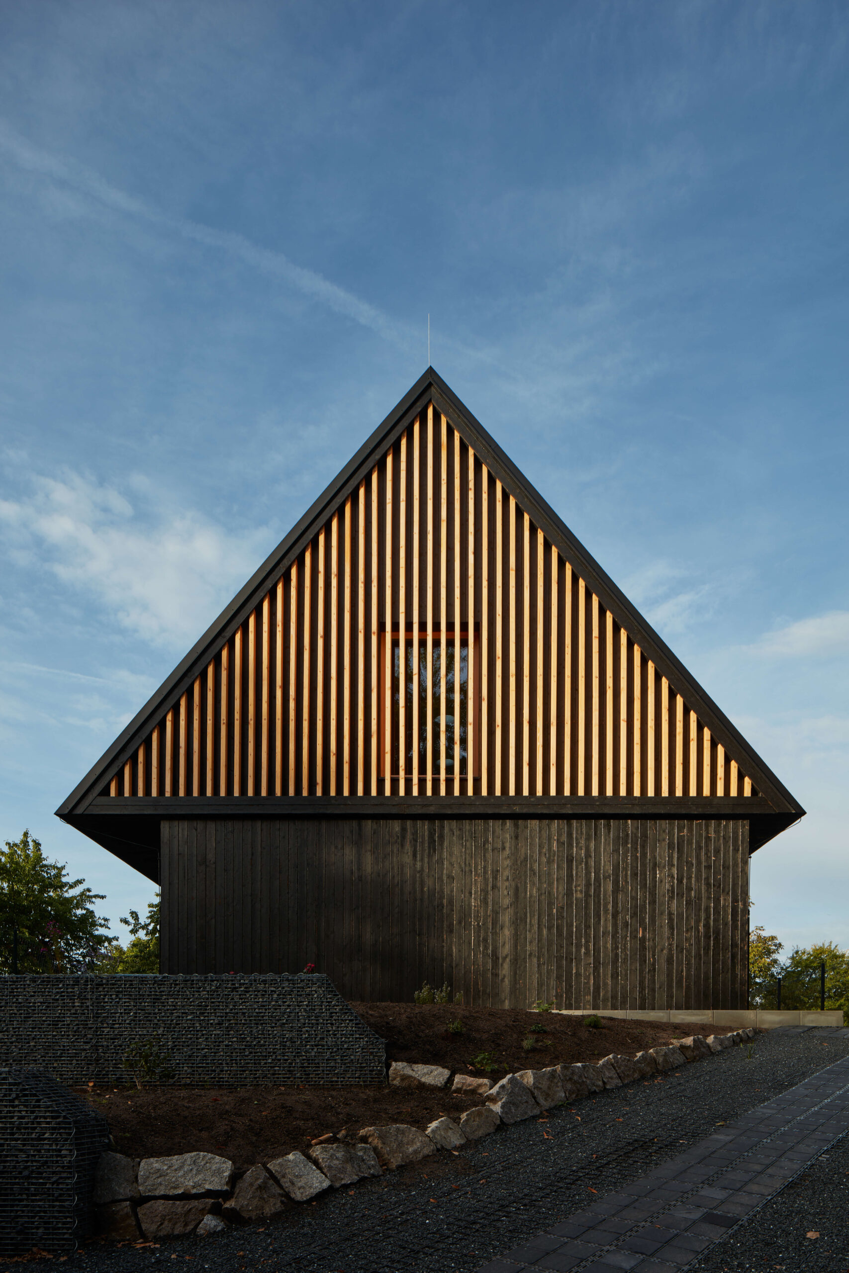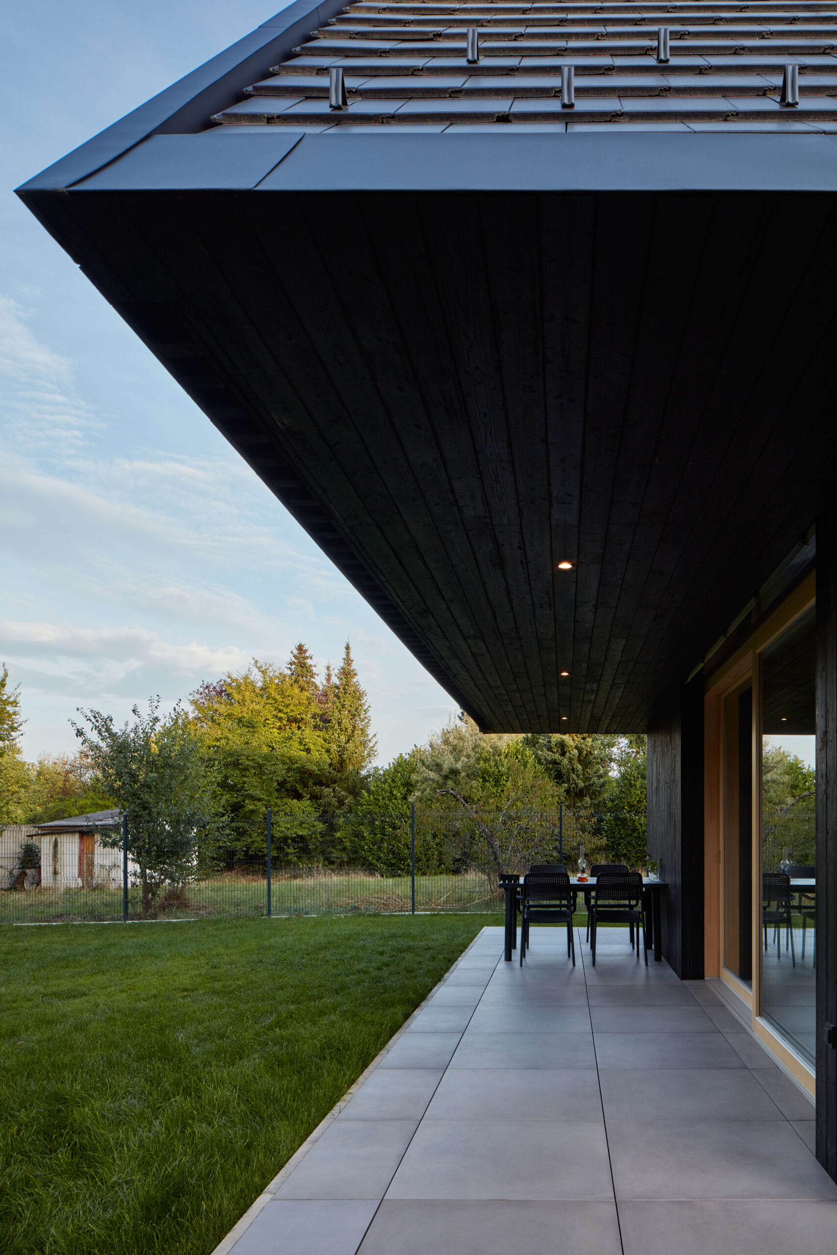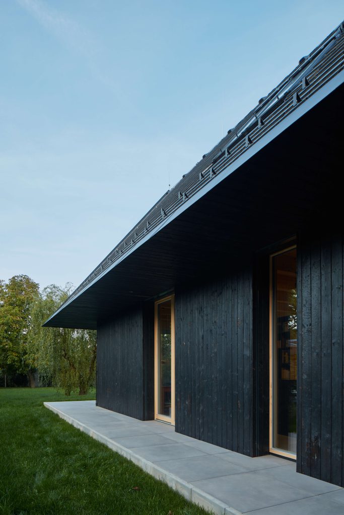 Objekt je koncipován jako dům ohně a dřeva. Jméno získal podle fasády z opalovaných prken, jejichž struktura dává stavbě výraz i hloubku. Tvar sedlové střechy a její výrazné přesahy vycházejí z okolní zástavby a zároveň zajišťují stínění jižní fasády a ochranu terasy. V přízemí se nacházejí dvě garsonky se samostatnými vstupy a společná technická část, v podkroví pak hlavní byt s ložnicí, pracovnou a koupelnou. Dům pracuje s jednoduchým objemem, promyšlenými proporcemi a přirozeným světlem.
