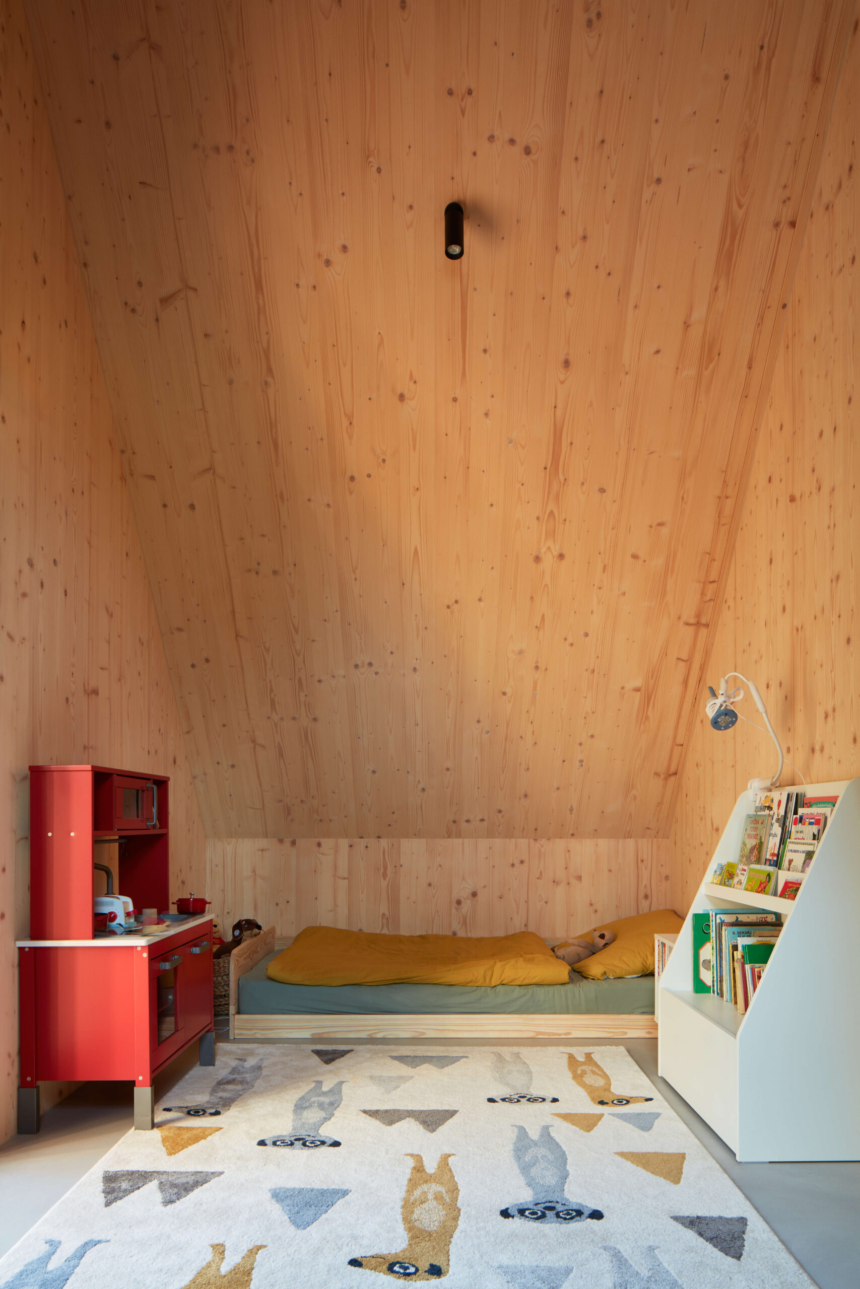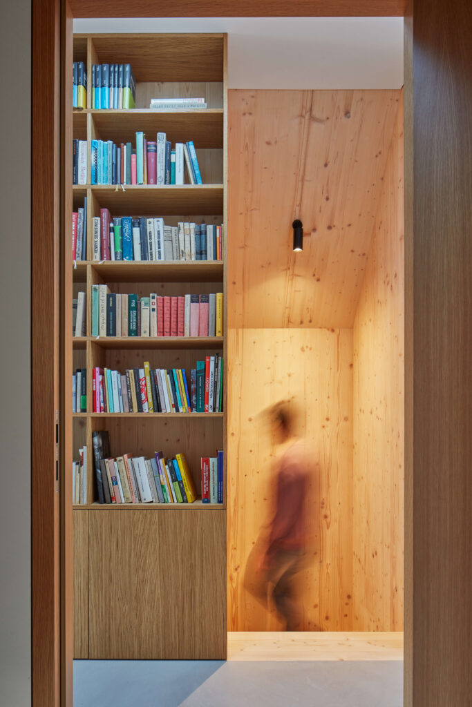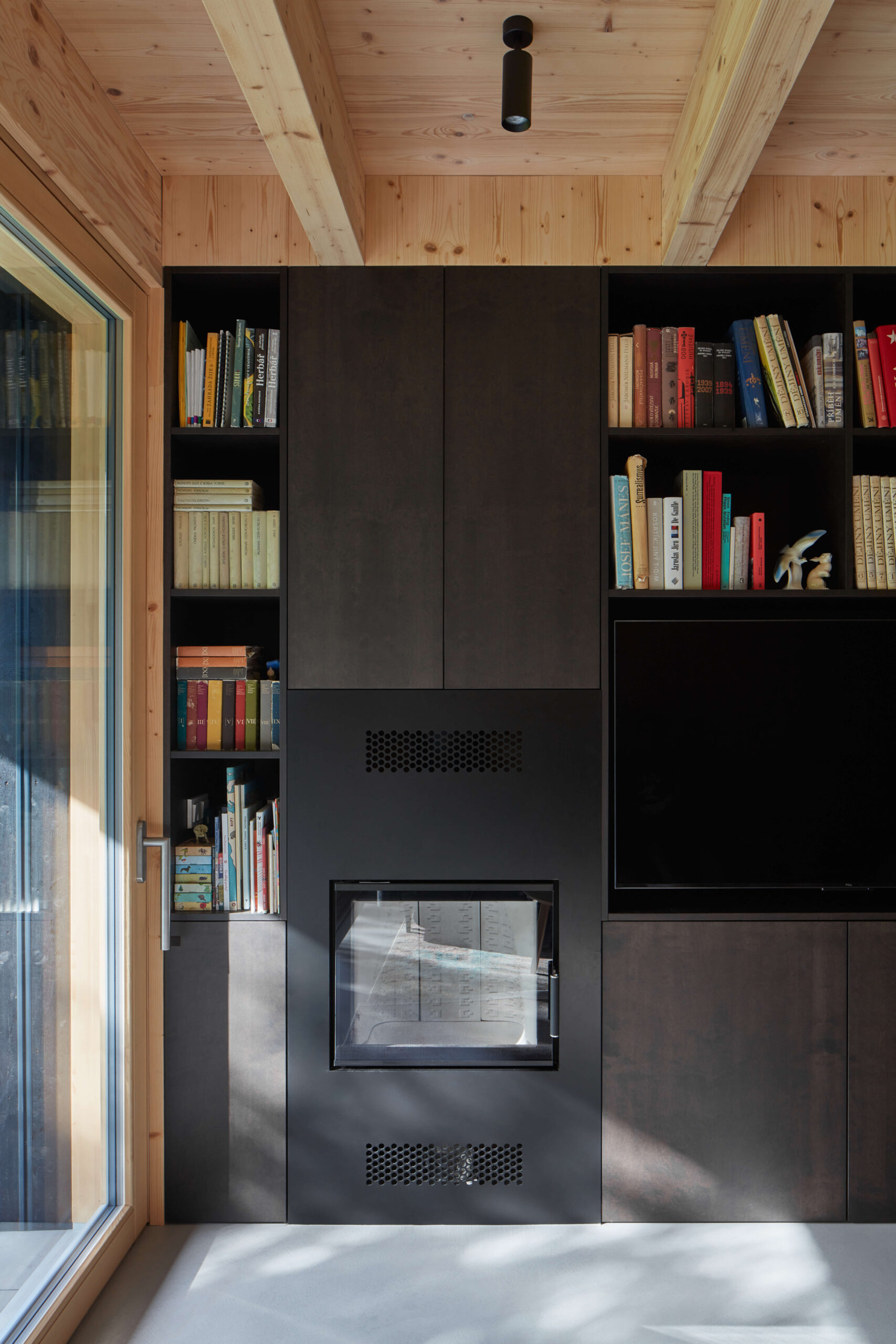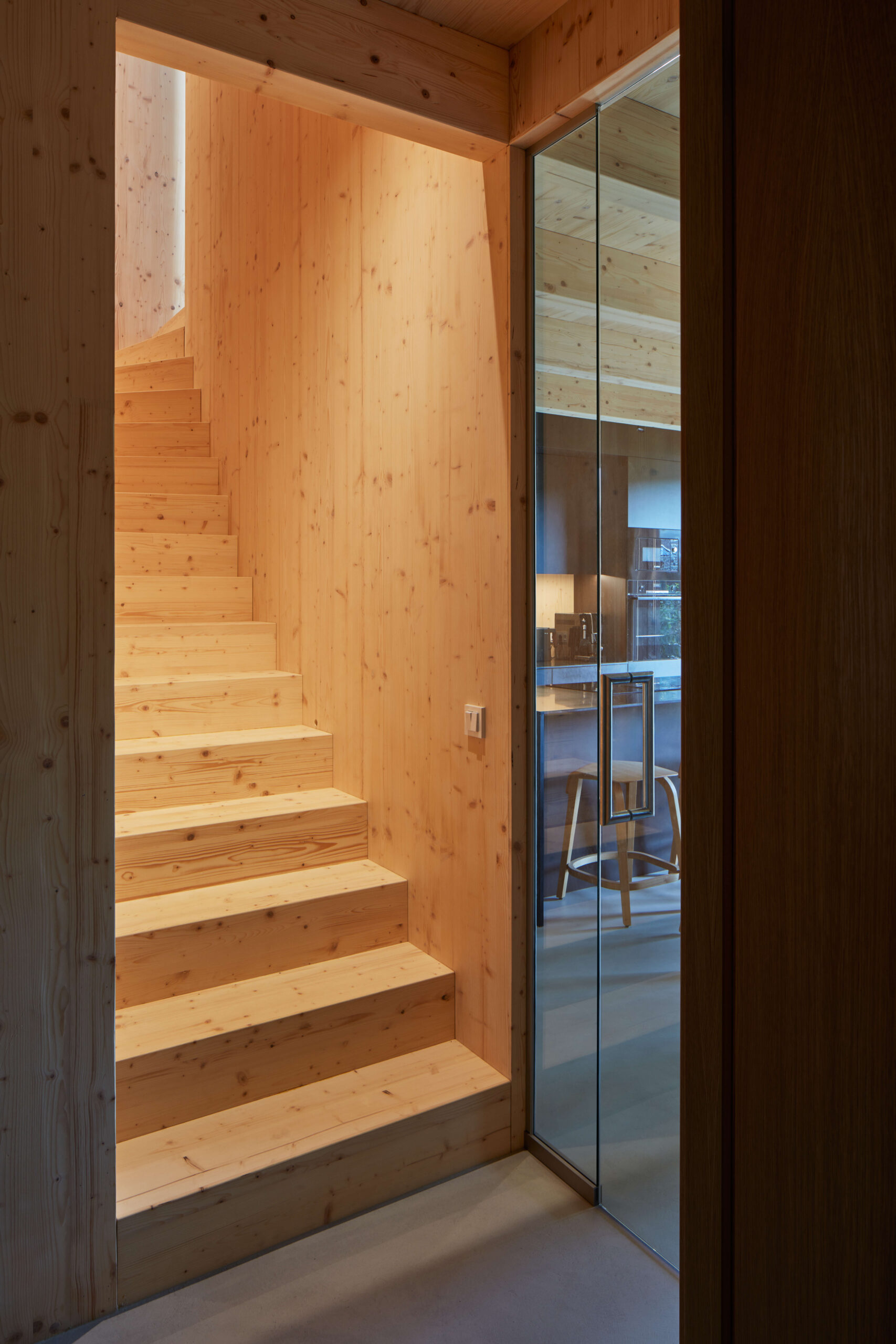 V interiéru se prolíná pohledové CLT dřevo a tmavší dubové prvky. Přiznané CLT panely tvoří konstrukci i finální povrch, nábytek a obklady ladí s tmavou fasádou. Celek působí klidně, soudržně a pravdivě – přírodní materiály, přesnost a uměřenost dávají domu charakter. Na malé ploše tu vznikl prostor, který spojuje řemeslnou jednoduchost, teplo dřeva a funkční logiku více bytového domu.