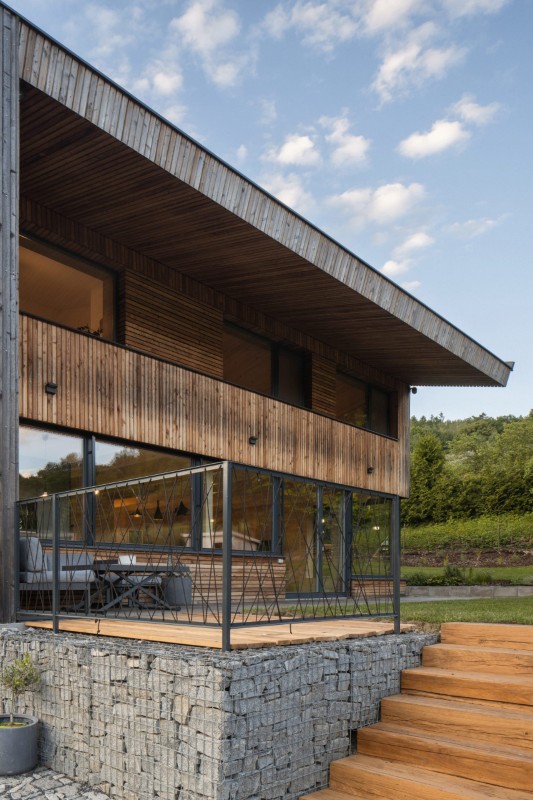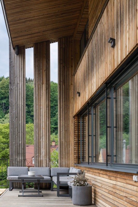 Dvoupodlažní dřevostavba z CLT panelů s dřevěnou fasádou a velkými okny