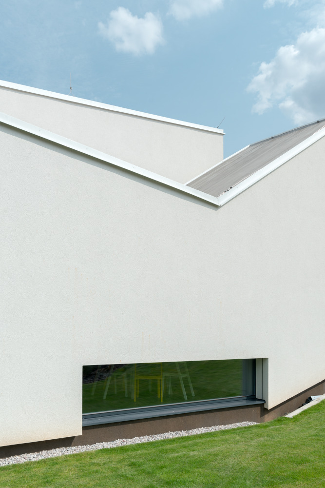 Zadání mladé rodiny bylo jasné – přáli si dřevostavbu s maximálně otevřeným obytným prostorem, dostatkem světla a přirozeným propojením se zahradou. Architekti Vojtěch Kaas a Jan Kalivoda vytvořili dům, který stojí na myšlence využití přirozeného světla jako hlavního prvku architektury. Zvenčí působí střídmě, uvnitř se však otevírá do velkorysého prostoru propojeného s krajinou. Výrazný prvek čelního prosklení – tzv. sluneční trychtýř – zachycuje světlo z jihu a nechává jej prostupovat celým domem až po severní fasádu. Světlo se tak stává součástí každodenního života a proměňuje atmosféru interiéru v průběhu dne.