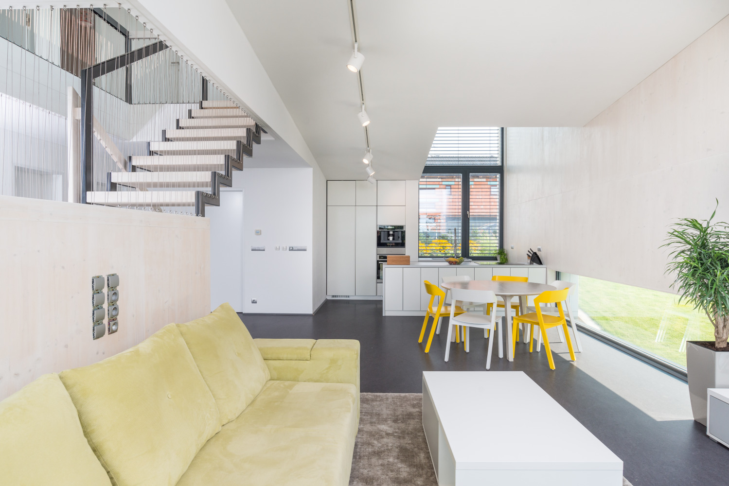 Dům je navržen v pasivním energetickém standardu, a to i přes složitější orientaci pozemku. Konstrukci tvoří masivní CLT panely, které umožnily otevřený obytný prostor bez vnitřních nosných stěn a výrazné horizontální okenní otvory. Kombinace přesné dřevěné konstrukce, kvalitního zateplení a řízeného větrání s rekuperací zajišťuje stálou teplotu i příjemné vnitřní klima po celý rok. Výsledkem je dům, který je energeticky úsporný, funkční a zároveň působí klidně a přirozeně.