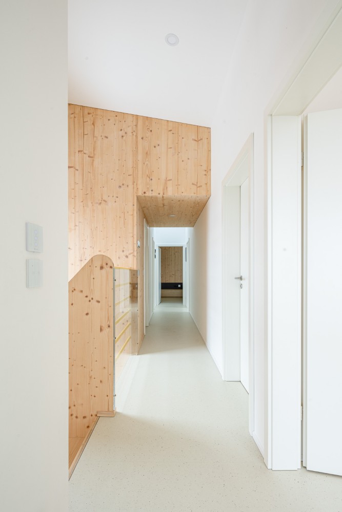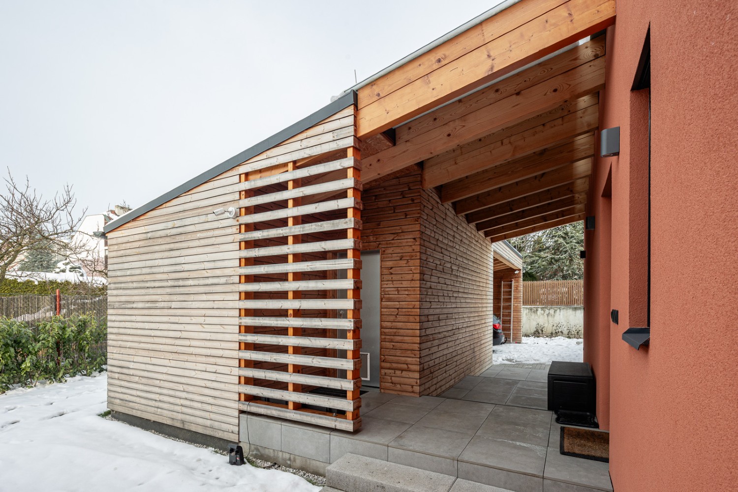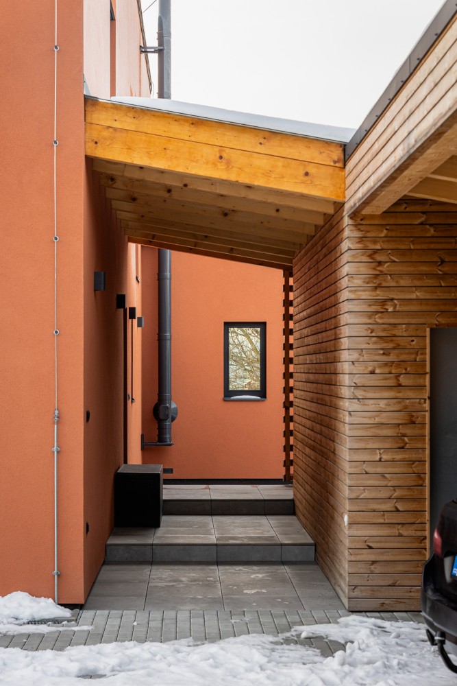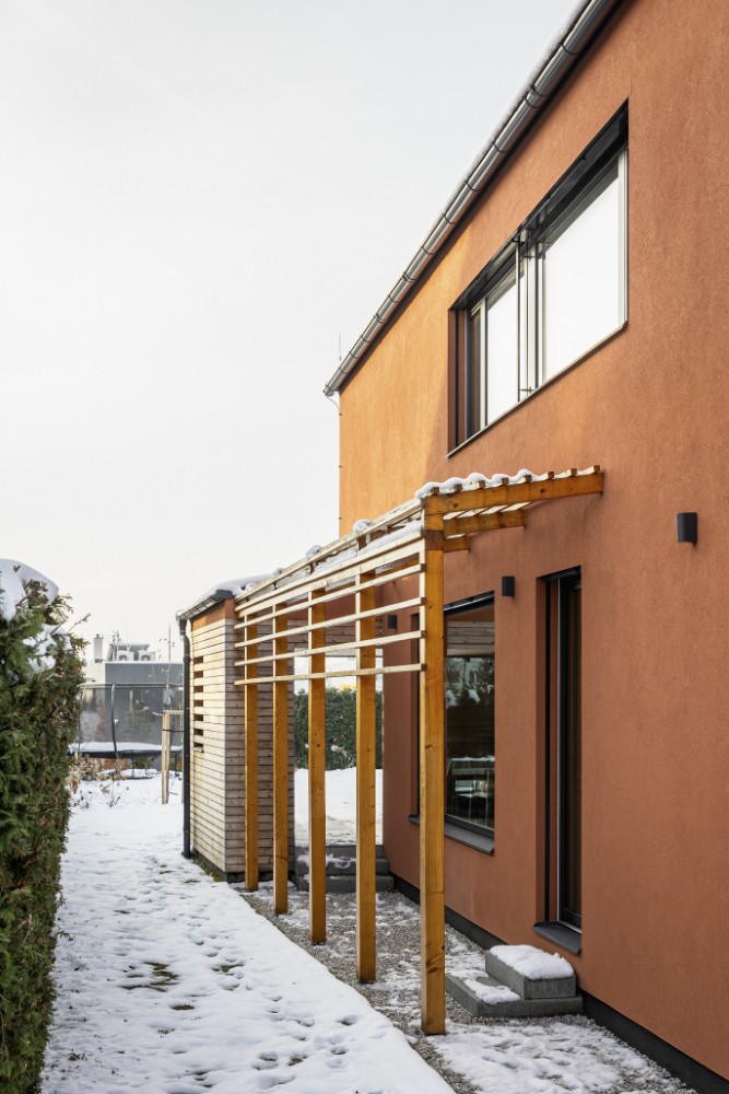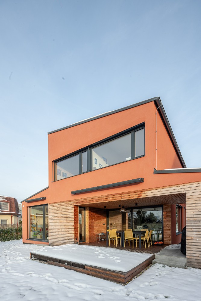 Fasáda v barvě terakoty doplněná dřevěným obkladem a tmavě šedými detaily působí moderně a přitom respektuje charakter okolí. Z obývacího prostoru se dům otevírá na krytou terasu a zahradu orientovanou na jih, kam přichází denní světlo ze dvou stran. Interiér s přiznaným dřevem CLT panelů je navržen minimalisticky, s důrazem na útulnost a nadčasovost.