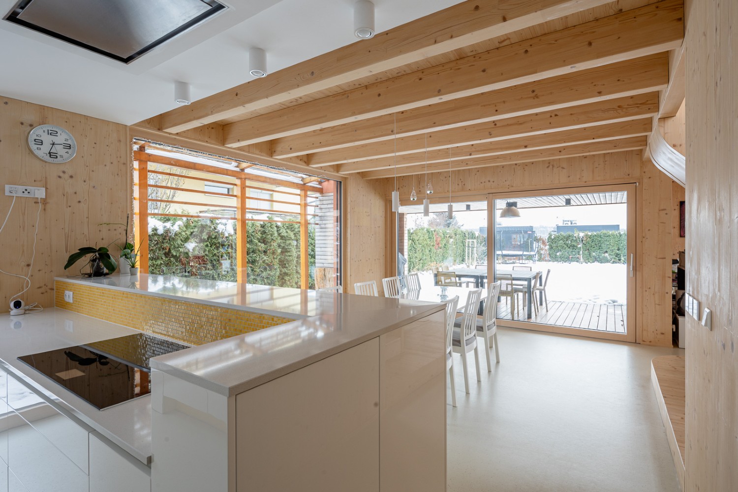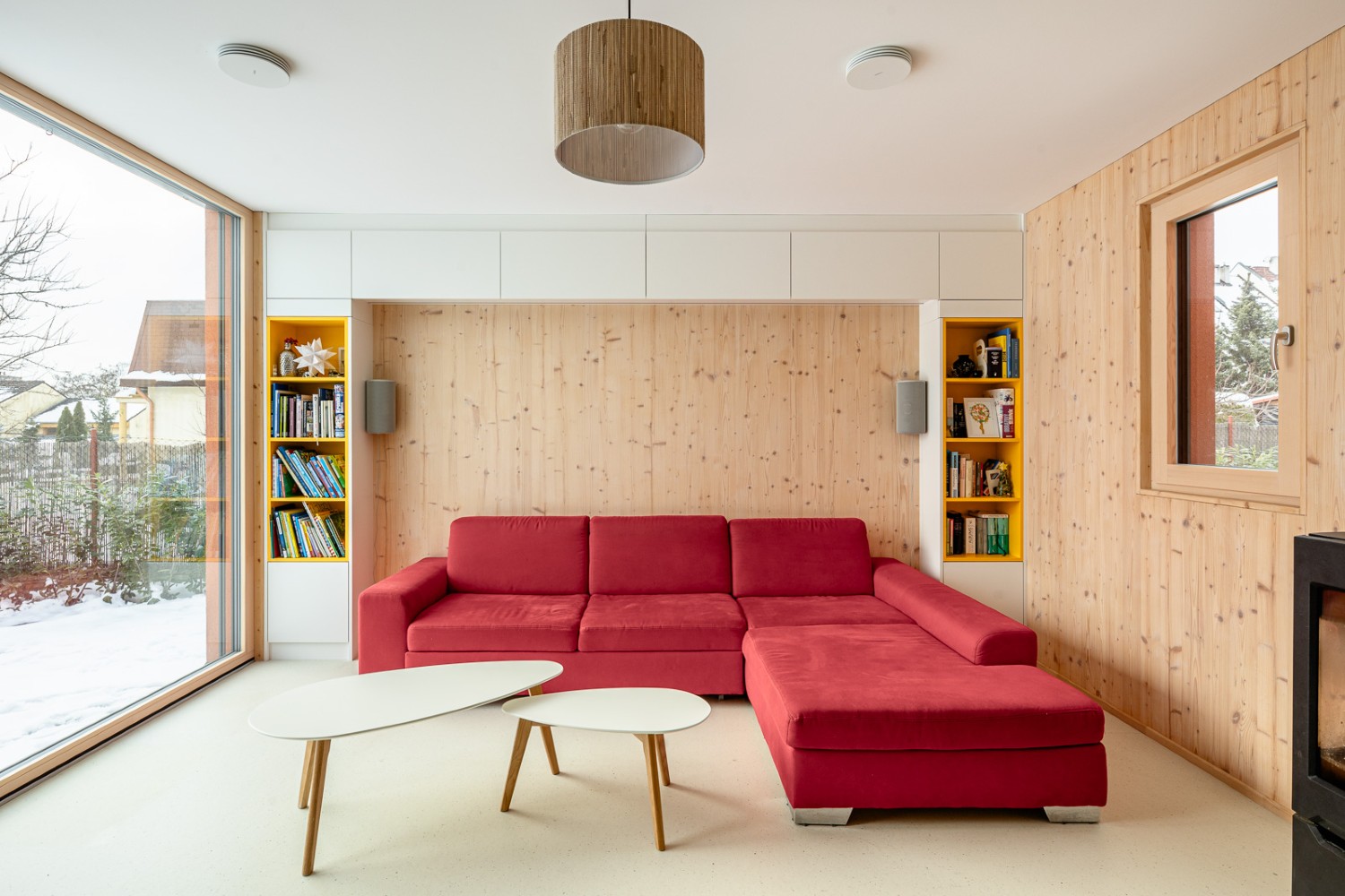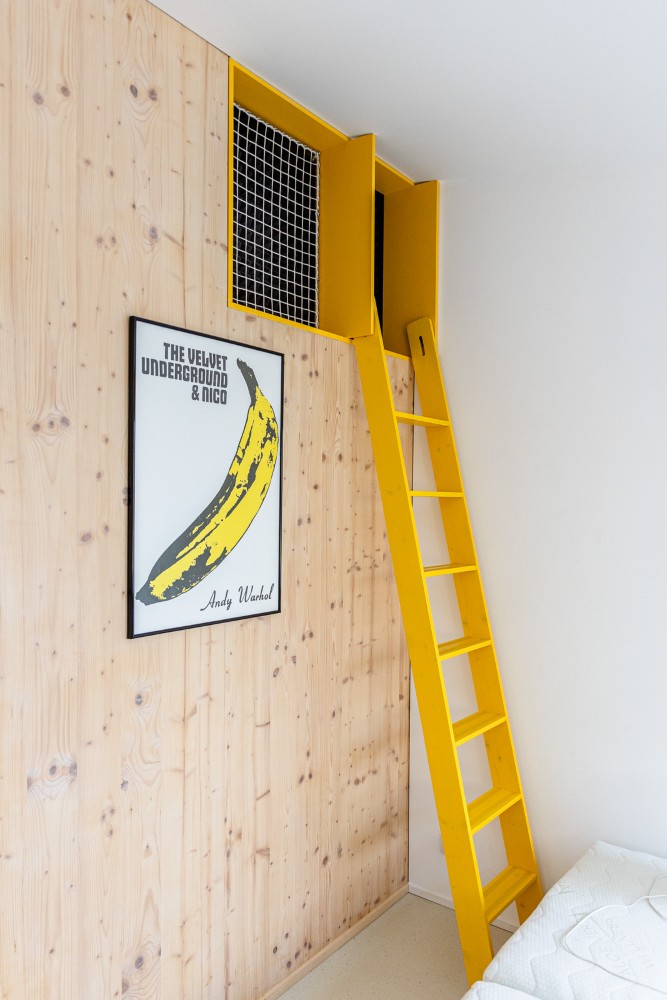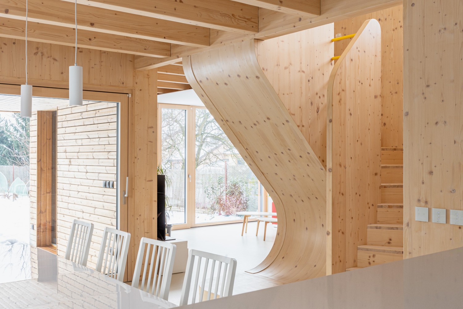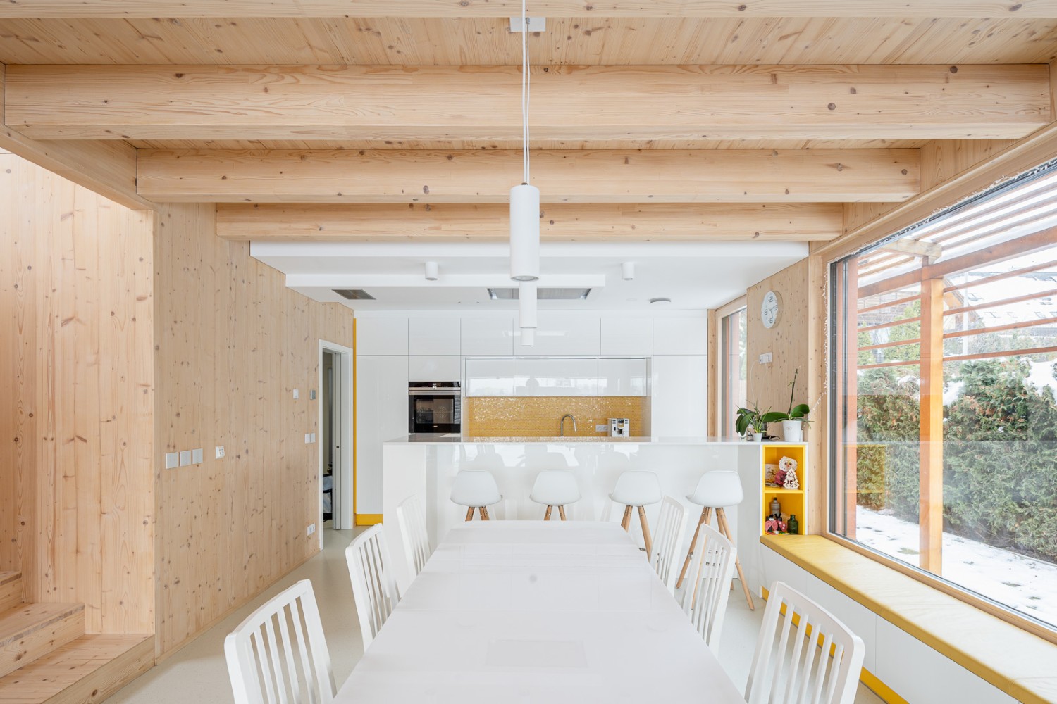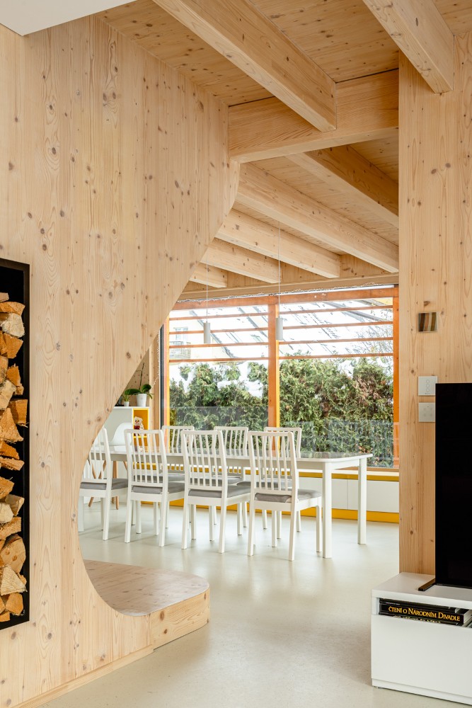 Dominují mu světlé dřevěné plochy, bílá a žlutá barevnost a originální schodiště se sochařským výrazem. Velkorysý obývací prostor, ložnice, klidová zóna i malá domácí posilovna ukazují, že tento dům dokáže spojit estetiku, praktičnost a osobitý styl.