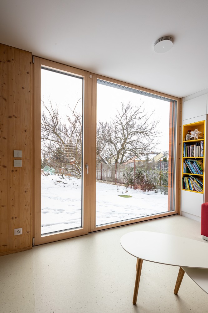 Moderní pasivní dům v Praze s dřevěnou terasou a velkými okny do zahrady