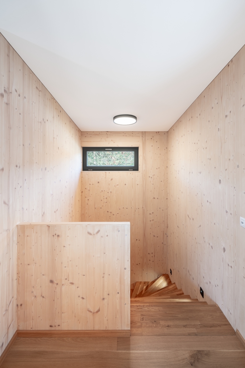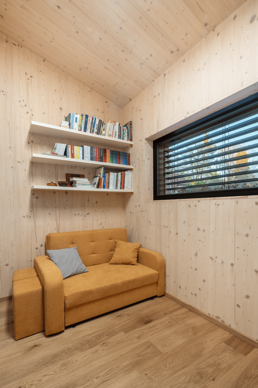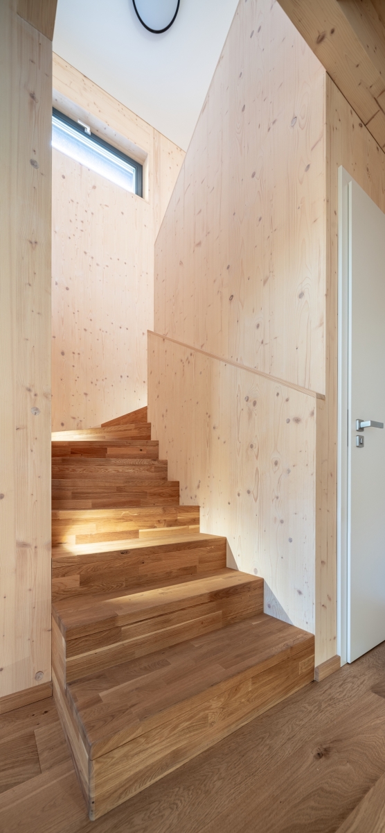 Rodinný dům z CLT panelů je navržený jako dvoupodlažní moderní dřevostavba. Hlavní prosklené plochy na jižní fasádě otevírají interiér do zahrady a zajišťují dostatek světla po celý den. V přízemí se nachází společné obytné prostory – kuchyň, jídelna a obývací pokoj, dále pracovna, technické a sociální zázemí. Se zahradou dům propojuje terasa s pergolou, která rozšiřuje obytný prostor ven. Ložnice, dětský pokoj a koupelna jsou situovány v patře. V interiéru zůstávají přiznané dřevěné prvky konstrukce, jejichž povrch je ošetřen olejovým nátěrem s jemným bílým pigmentem.