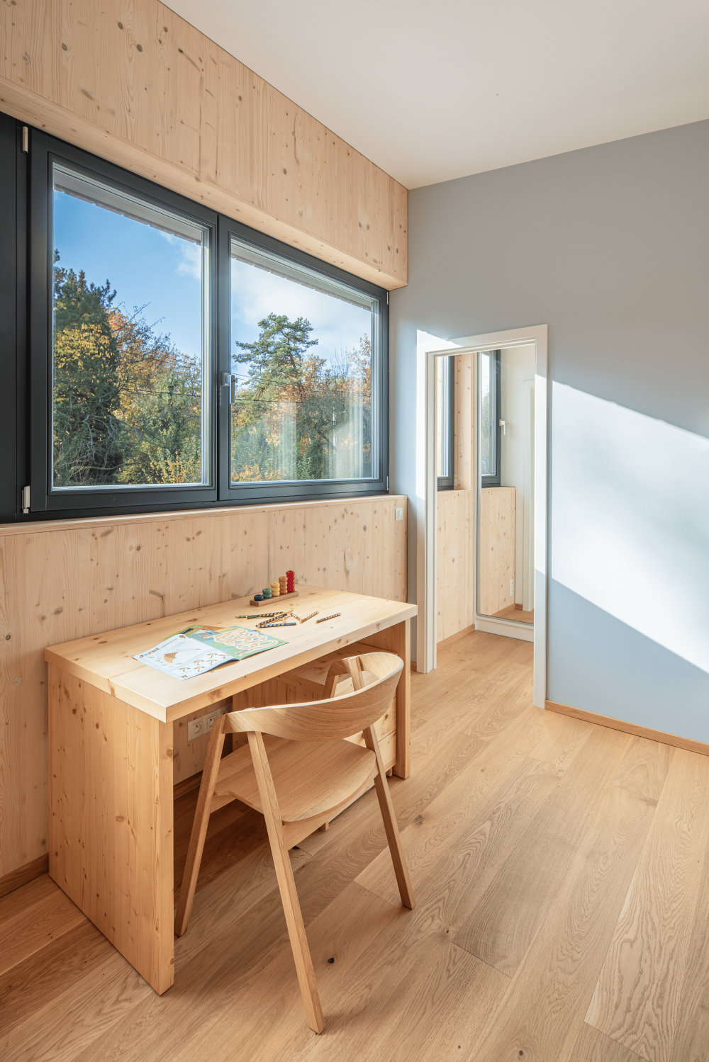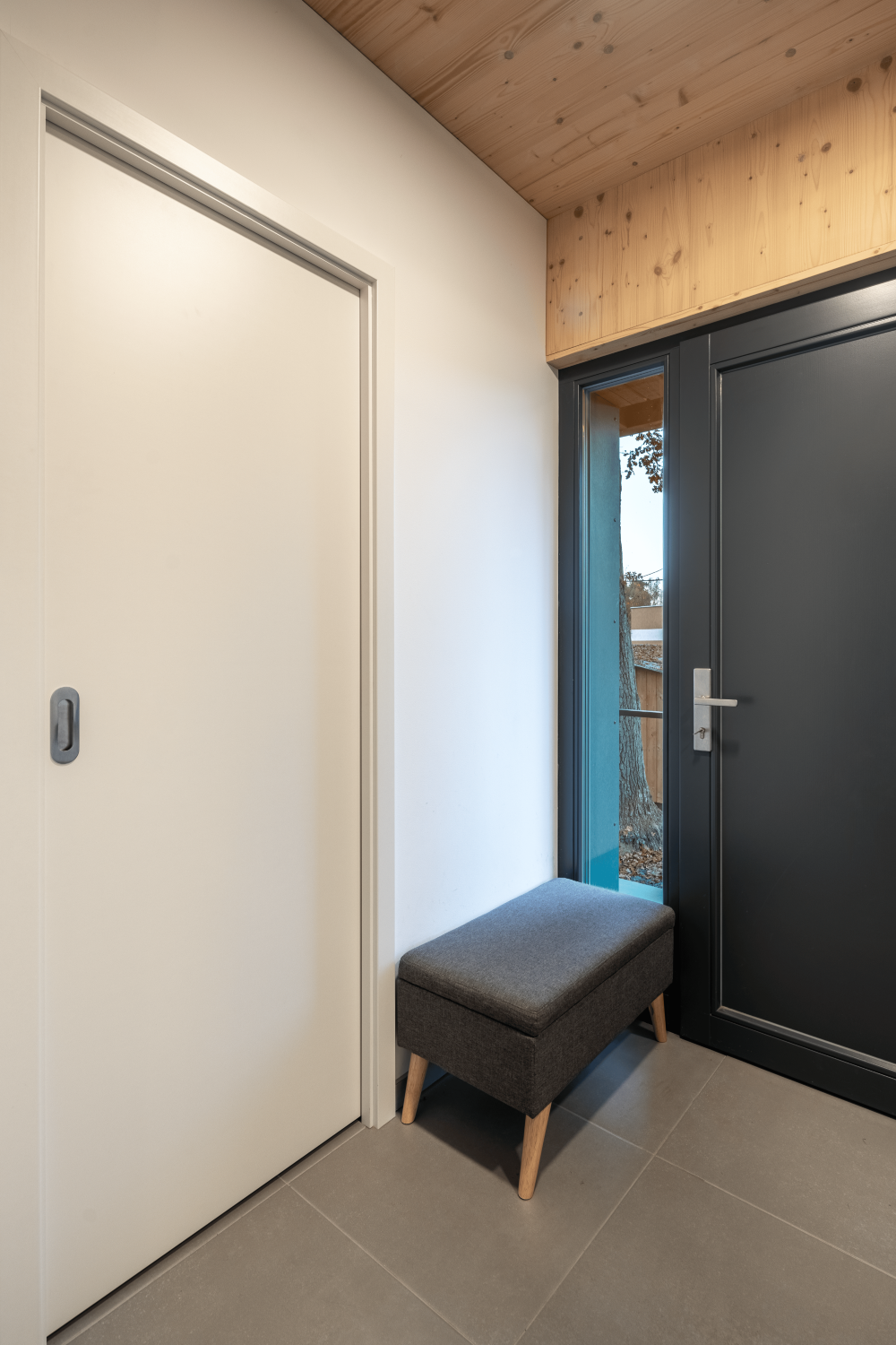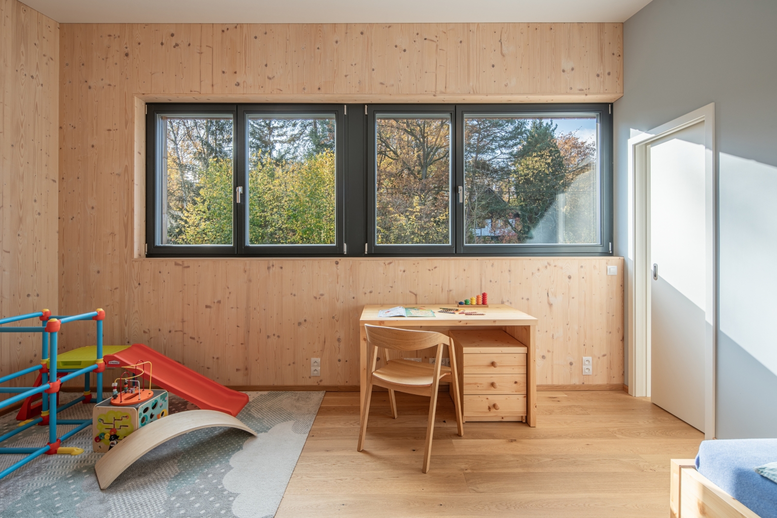 Rodinný dům z CLT panelů je navržený jako dvoupodlažní moderní dřevostavba. Hlavní prosklené plochy na jižní fasádě otevírají interiér do zahrady a zajišťují dostatek světla po celý den. V přízemí se nachází společné obytné prostory – kuchyň, jídelna a obývací pokoj, dále pracovna, technické a sociální zázemí. Se zahradou dům propojuje terasa s pergolou, která rozšiřuje obytný prostor ven. Ložnice, dětský pokoj a koupelna jsou situovány v patře. V interiéru zůstávají přiznané dřevěné prvky konstrukce, jejichž povrch je ošetřen olejovým nátěrem s jemným bílým pigmentem.