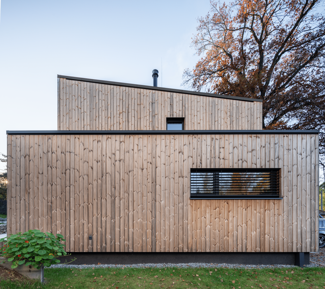 Tvar domu má jednoduchou a čitelnou geometrii. Základní kvádr je otevřený do zahrady a prořezaný velkými okny, která přivádějí světlo do hlavních obytných prostor. Pultová střecha vytváří přirozenou dynamiku a různou výšku stropů v jednotlivých místnostech. Fasádu tvoří prkna z borovice Thermowood, která časem získávají přirozenou šedou patinu. Okna, dveře i střešní krytina v odstínu antracitu podtrhují střídmý a vyvážený výraz celé stavby.