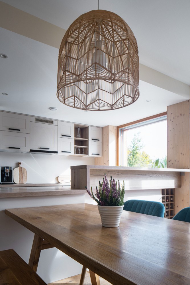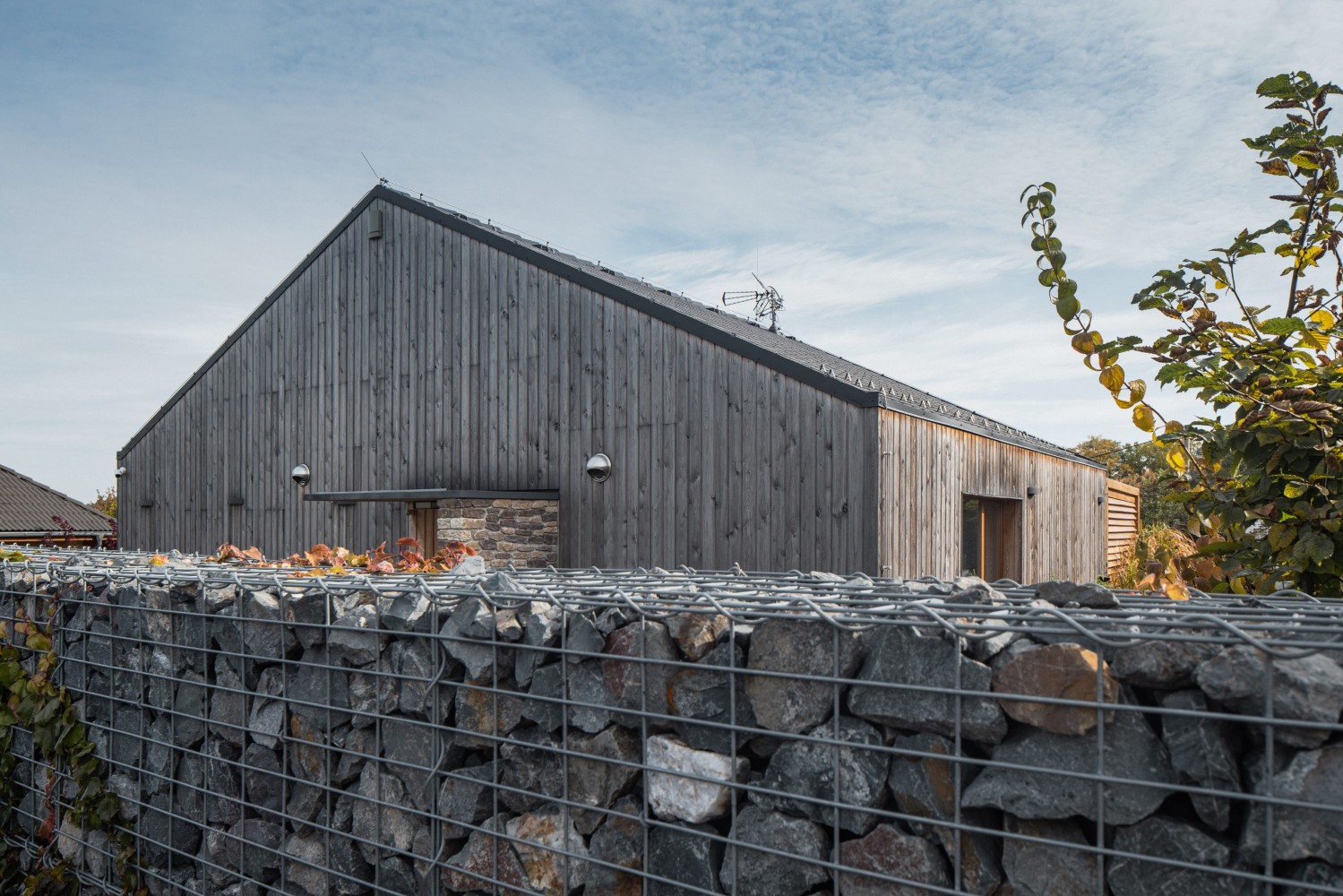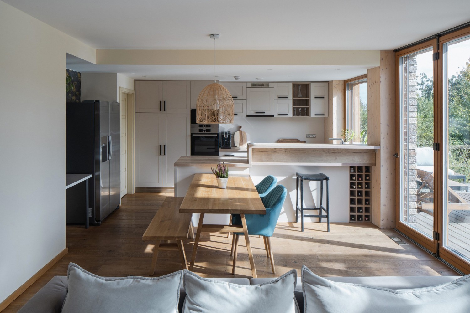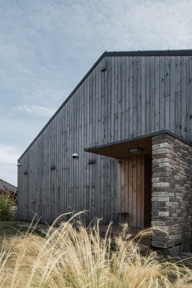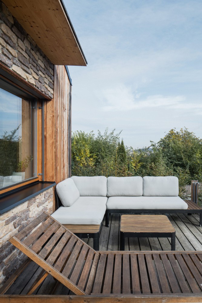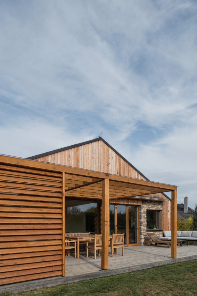 Použité materiály byly voleny s ohledem na krajinný charakter místa. Fasáda ze sibiřského modřínu v kombinaci s kamenným obkladem působí přirozeně a časem získává patinu, která stavbu propojuje s okolím. Sedlová střecha s taškovou krytinou navazuje na tradiční tvarosloví venkovské architektury, ale zpracováním i detaily odpovídá současným technickým i estetickým požadavkům. Výsledkem je moderní dřevostavba z CLT panelů, která harmonicky zapadá do krajiny a nabízí klidné, úsporné a zdravé bydlení.