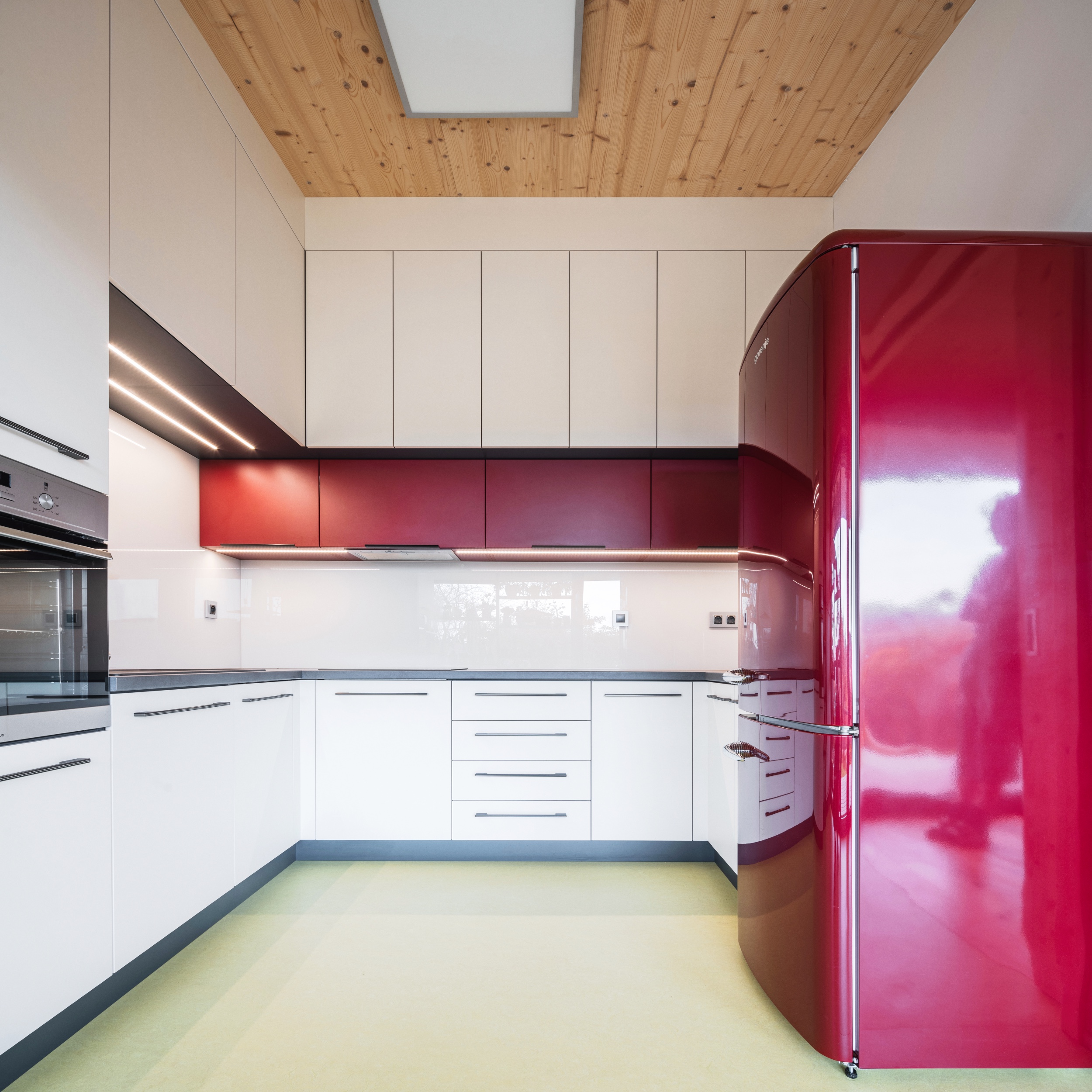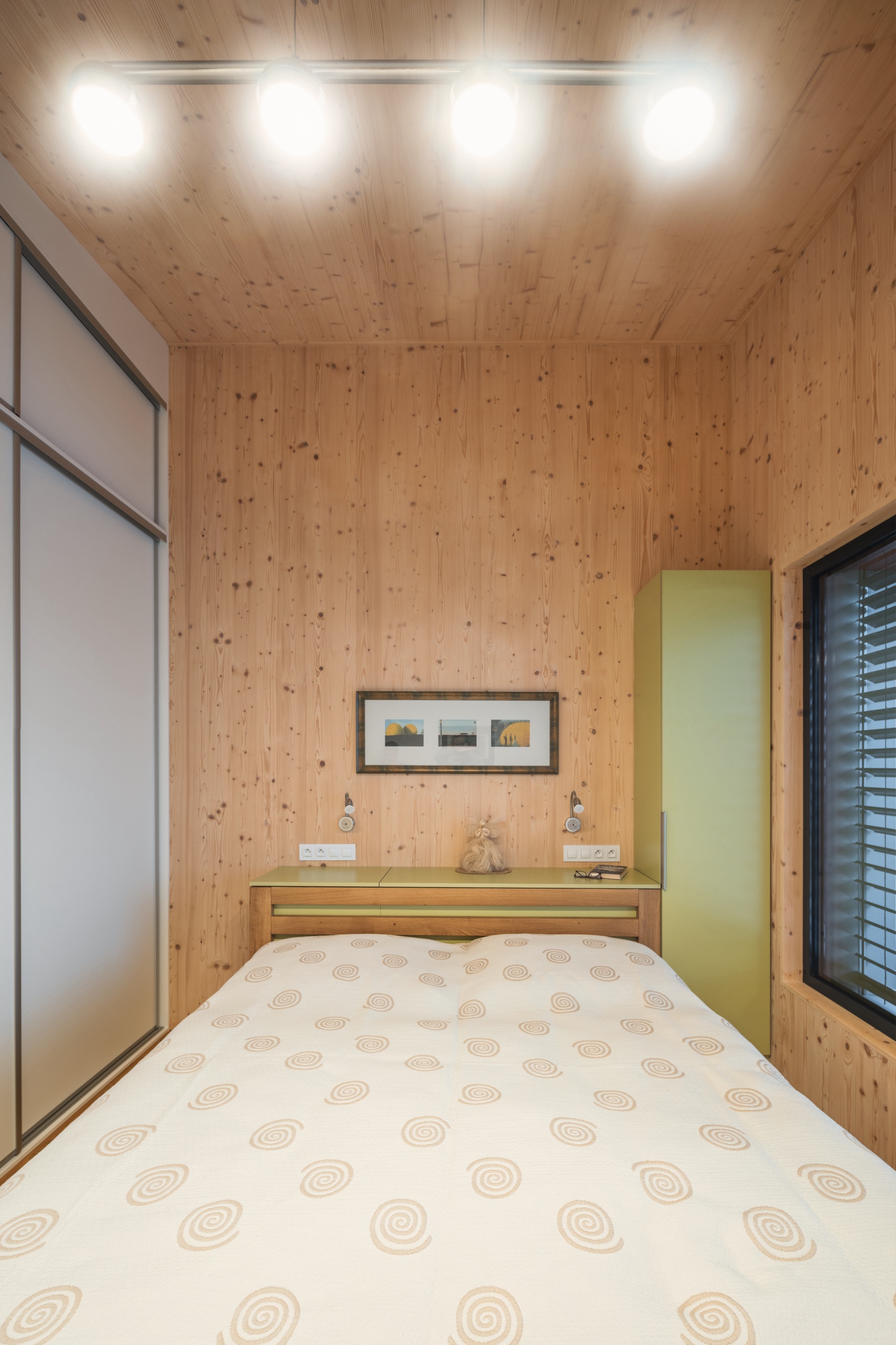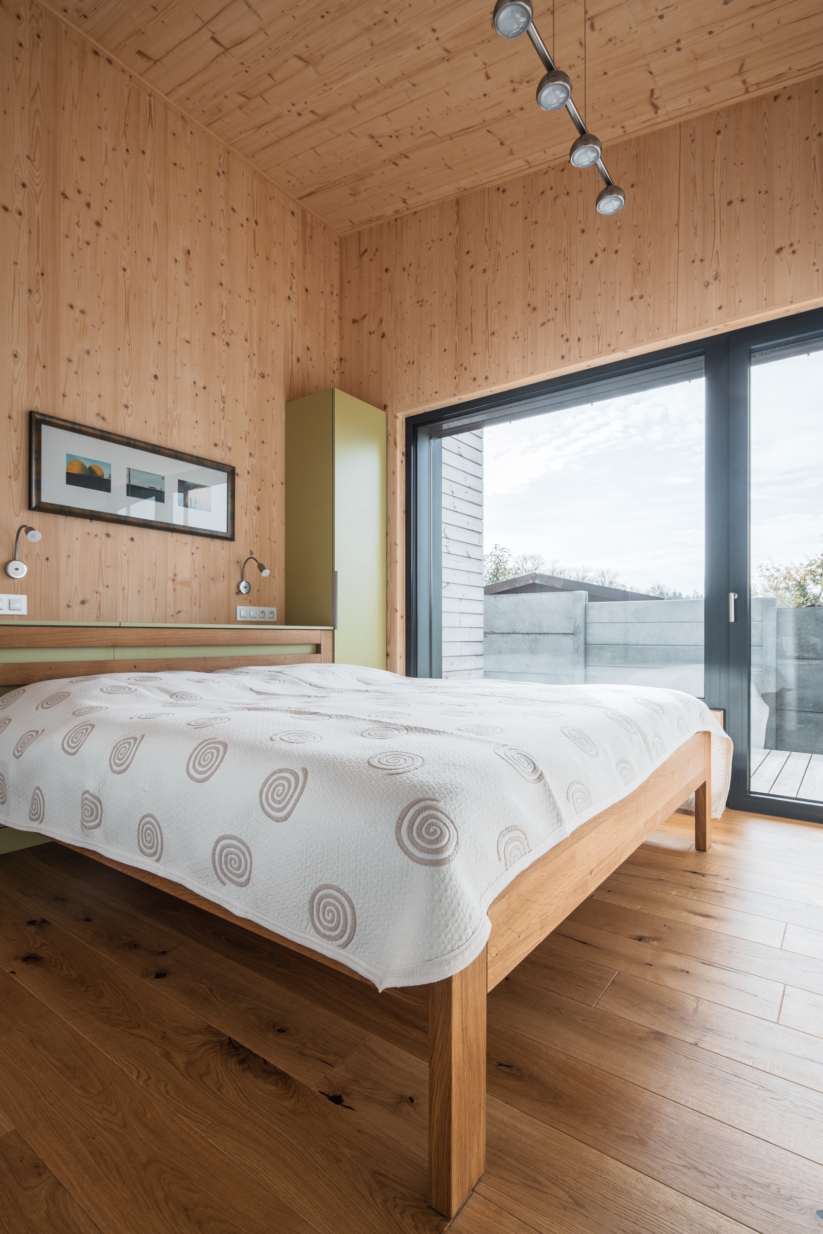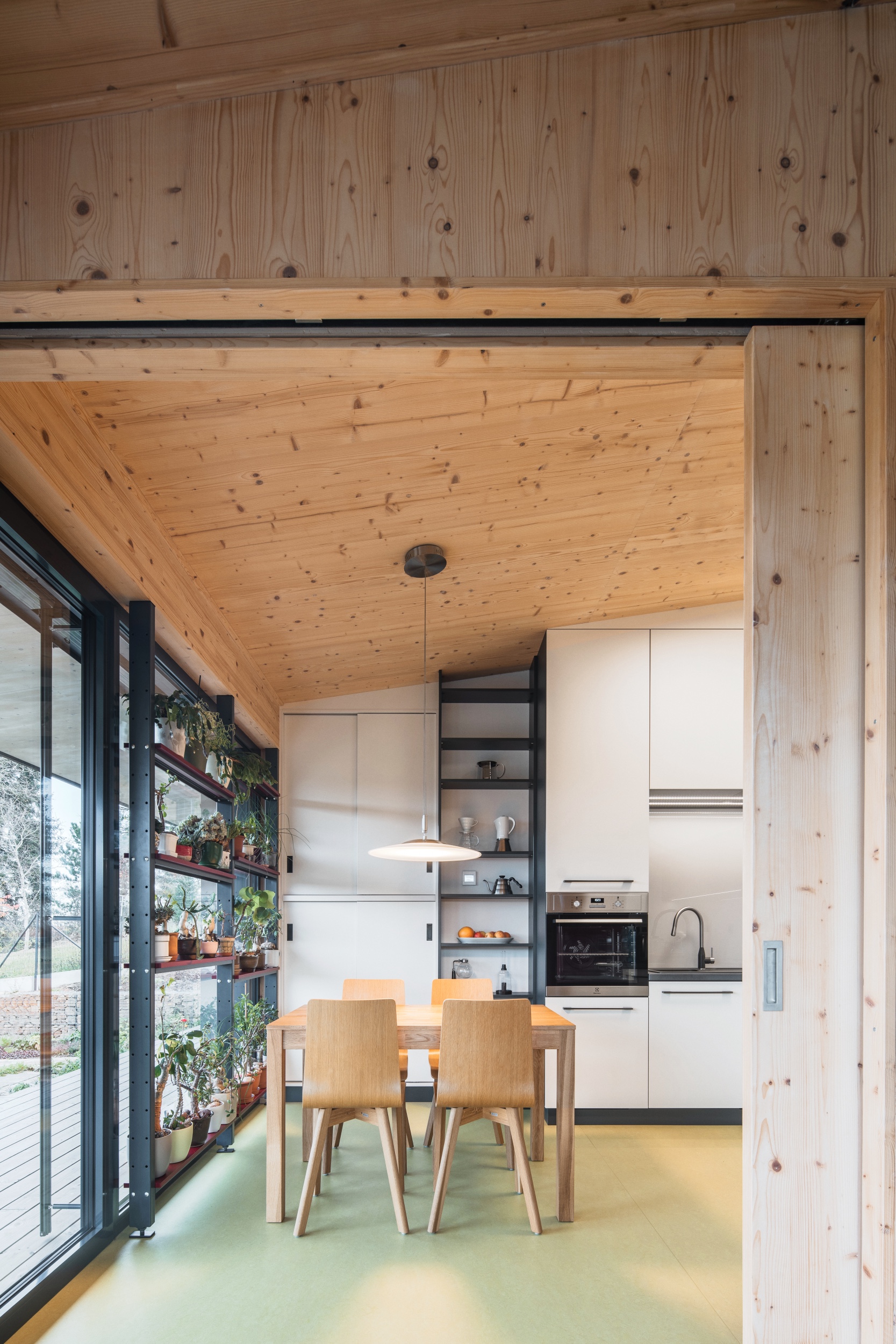 Uvnitř domu vládne klid a promyšlenost. Interiér z přiznaného dřeva doplňují tlumené barvy a jednoduché linie, které působí útulně a zrale. Dům nabízí prostor pro život bez zbytečností, ale i místo pro radosti – knihovnu, dostatek úložných prostor a malý sklep pod terasou, který nahradil původně plánovaný suterén. Stavba z masivních CLT panelů spojuje dlouhou životnost s příjemným vnitřním klimatem, takže je připravená sloužit svým majitelům dlouhá léta bez náročné údržby.