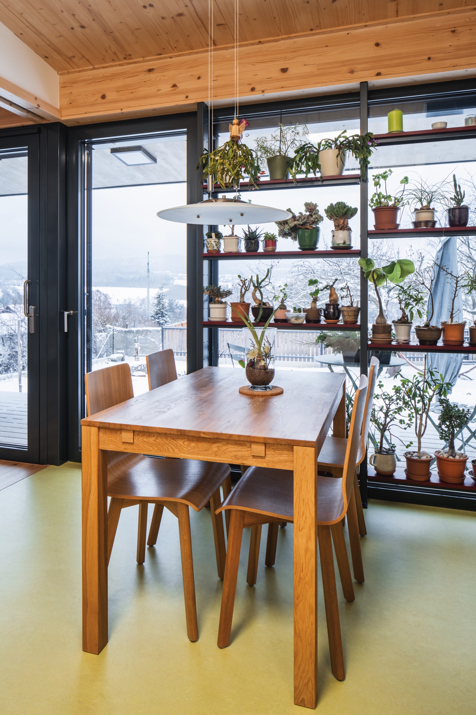 Halka: "Nemám ráda jiné než pravé úhly, liché počty a vůbec všechny nepravidelnosti. Když architekt navrhl šikmý strop, byla jsem nejprve kategoricky proti. Ale jeho argumenty pro optické zvětšení plošně malých místností byly natolik rozumné, že jsem následně prolistovala stoh vašich časopisů, prohlédla si fotky místností se šikmými stropy a nakonec souhlasila. Nelituji toho. Moje hlava si to přebrala dobře, stejně jako obavu z velikého prosklení. Teď vím, že dokážu „žít ve světle“ a dokonce jsem z něj nadšená. Nejenom kvůli přirozenému osvětlení interiéru a úžasnému výhledu na Brdy, ale i proto, že když chceme „zatopit“, stačí vytáhnout žaluzie. Nový dům je proti našemu původnímu zděnému výrazně úspornější."
